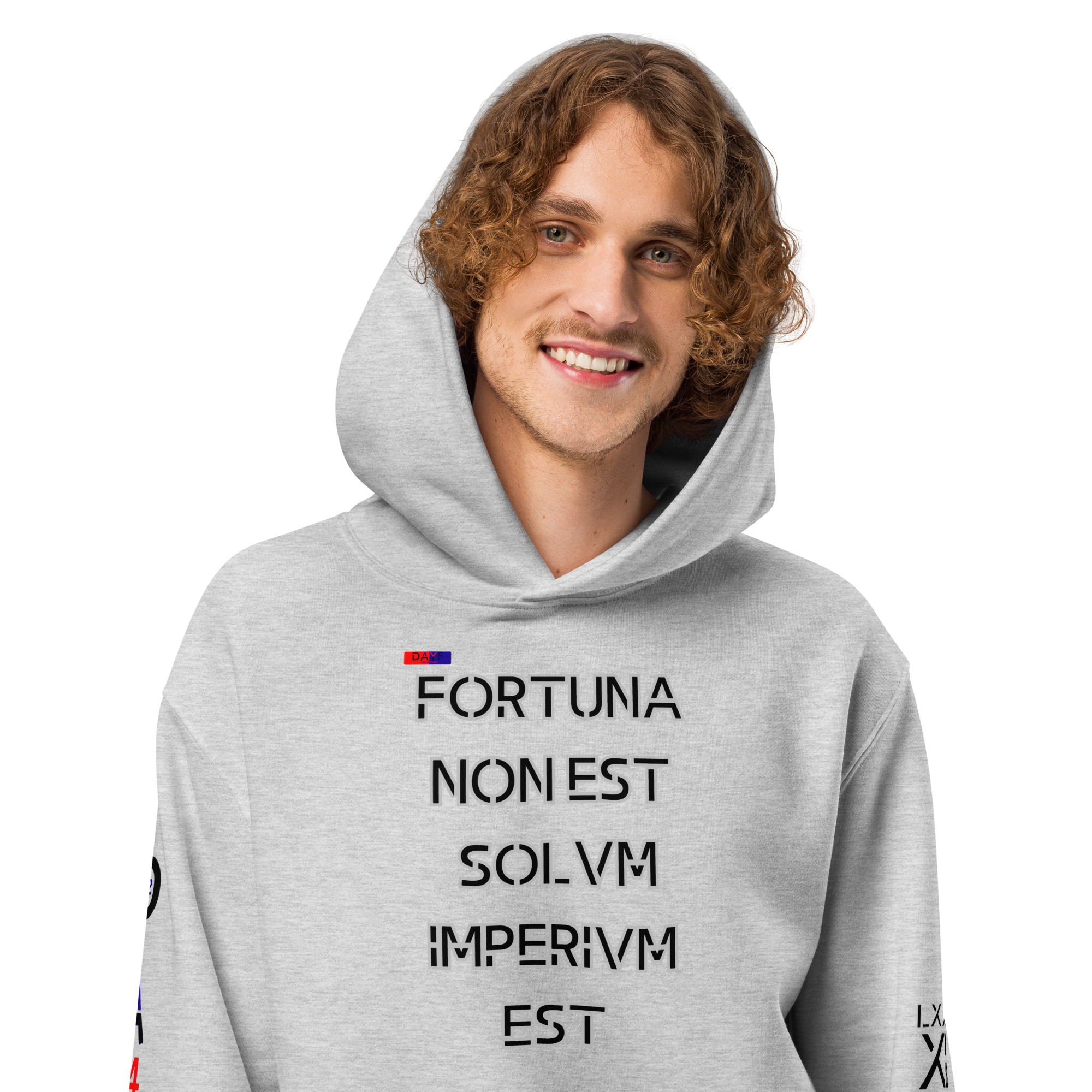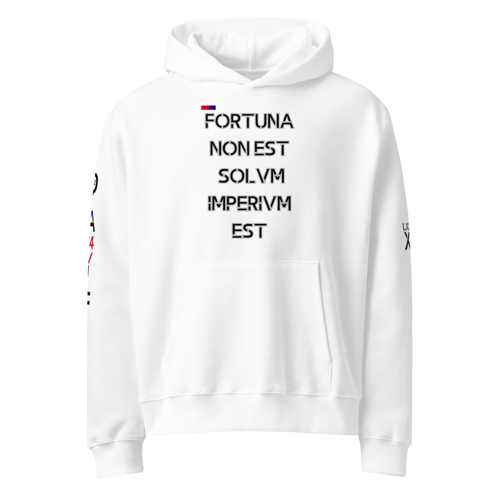I choose this oversized heavyweight hoodie because FORTUNA NON EST SOLVM IMPERIVM EST on the front reflects how I see life. Honest simple steady with budget money control clarity and saving shaping my choices. A strong clean piece that stays true without noise.