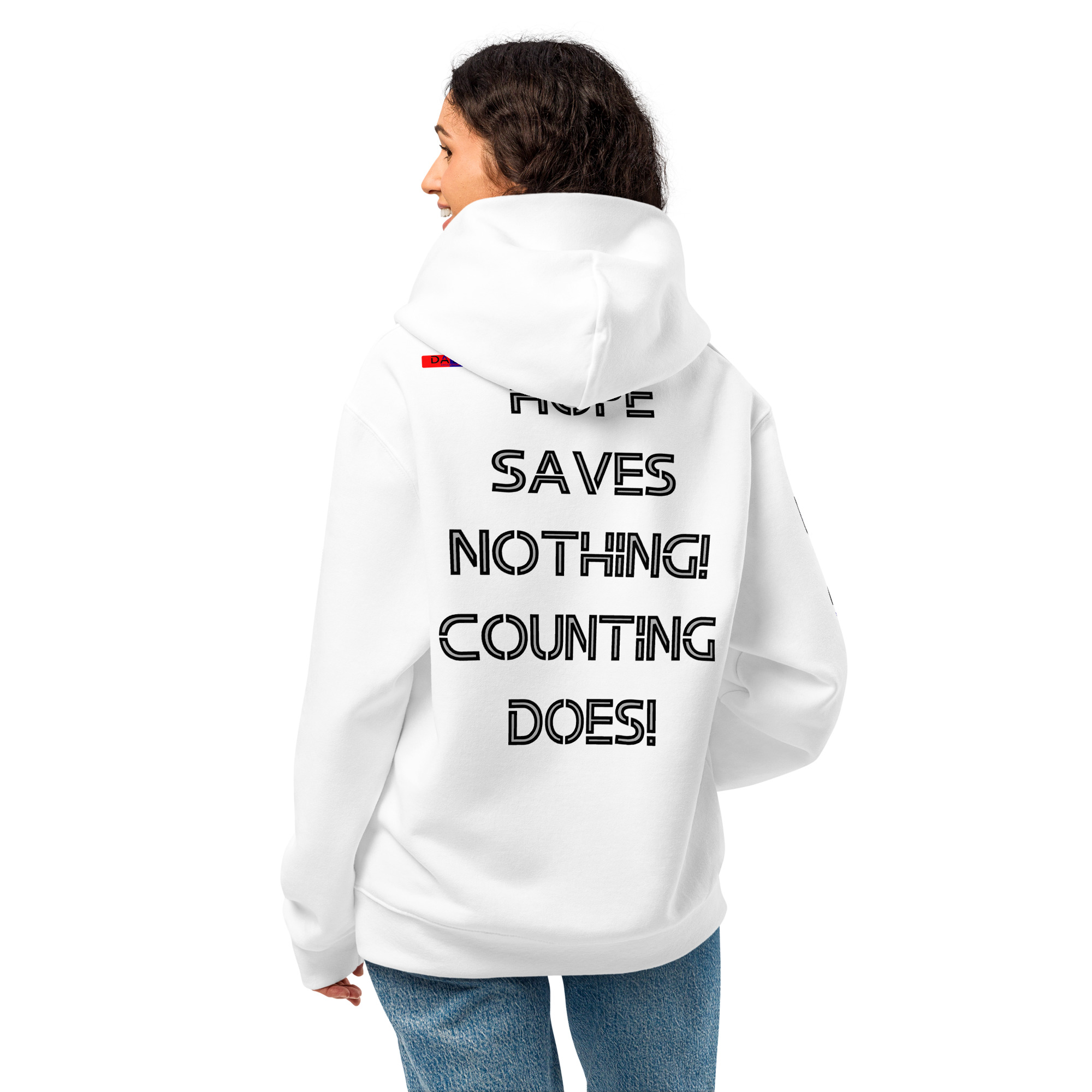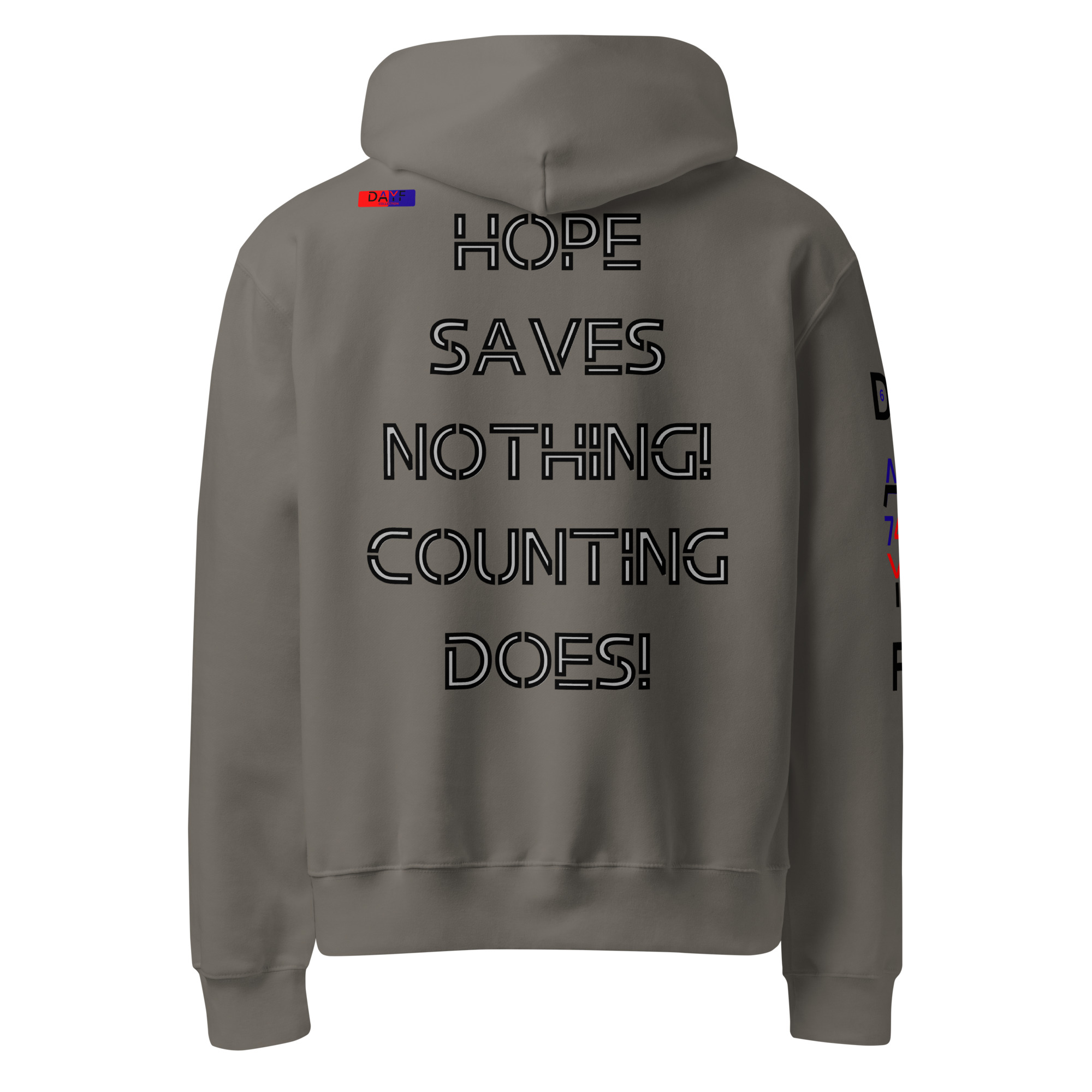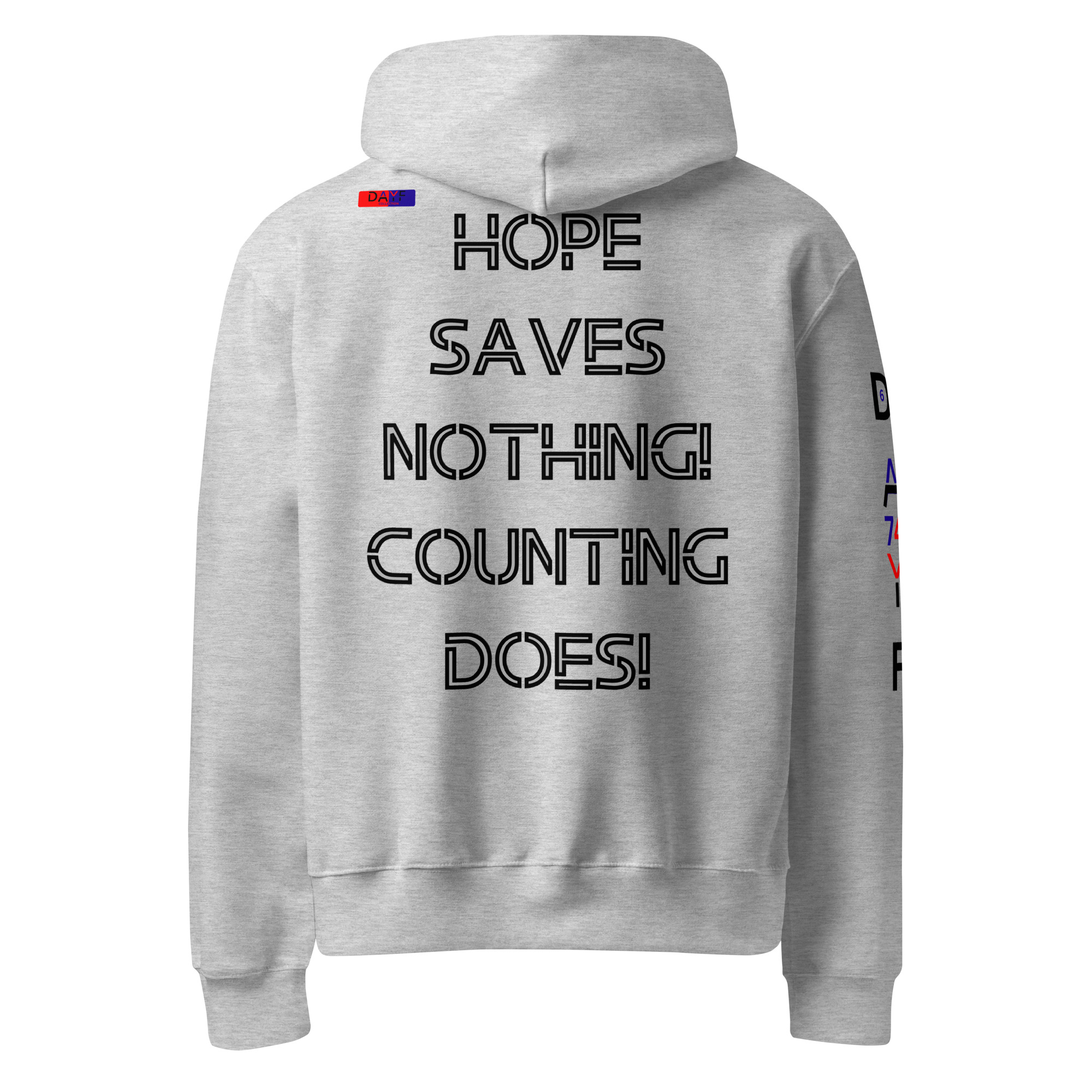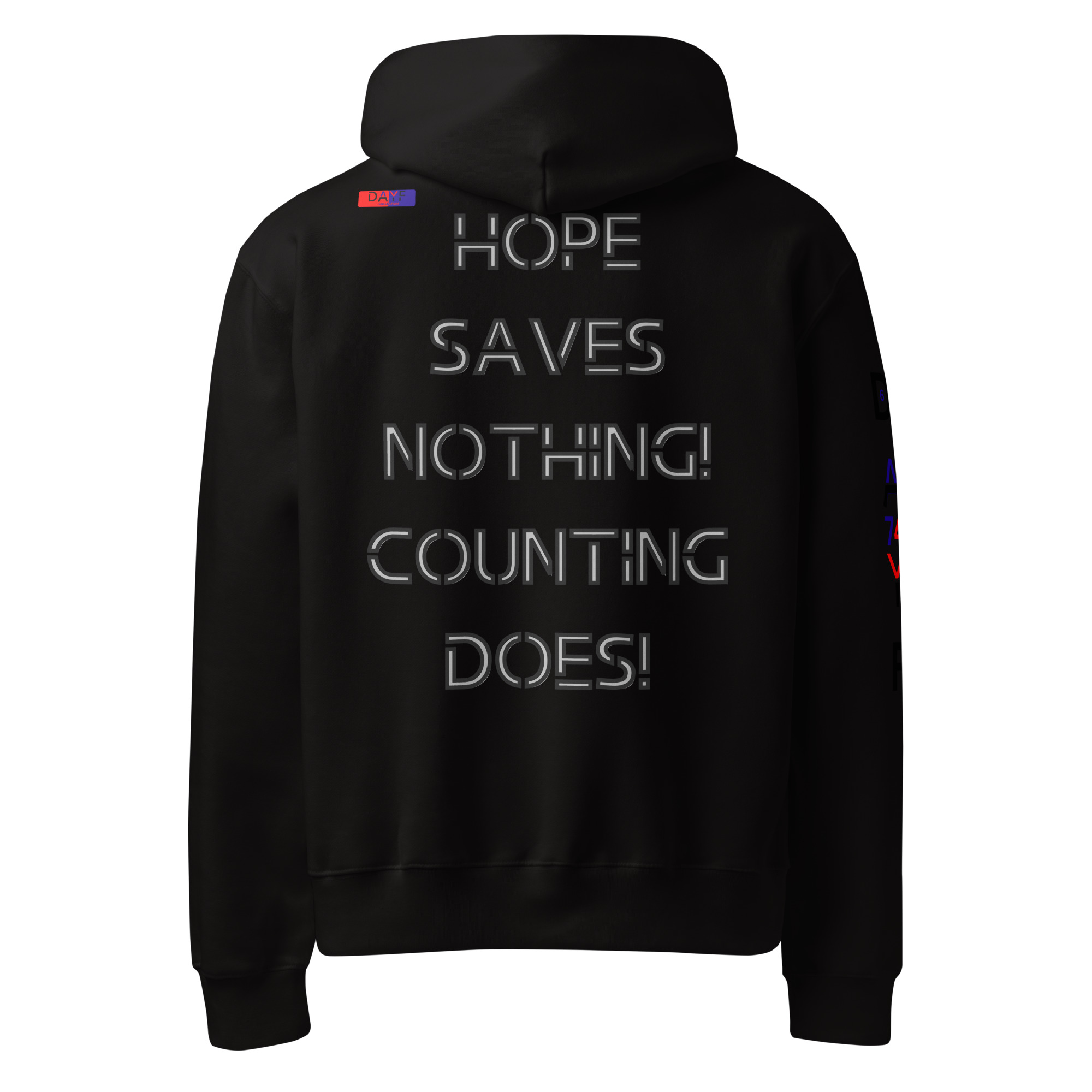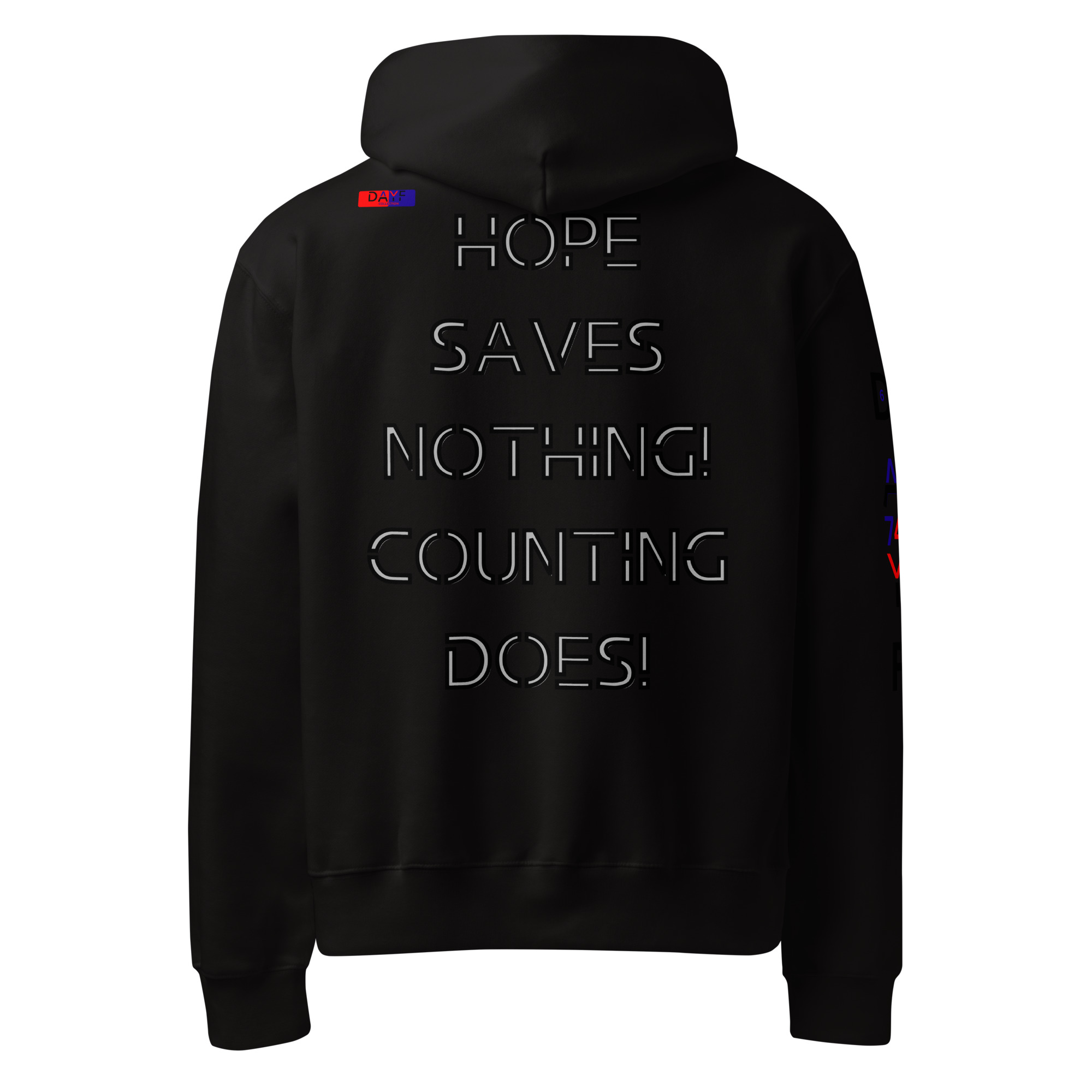 I wear this oversized heavyweight hoodie because HOPE SAVES NOTHING COUNTING DOES on the back speaks my truth. Honest steady with budget money clarity control and saving. A clean piece that keeps my mindset grounded.