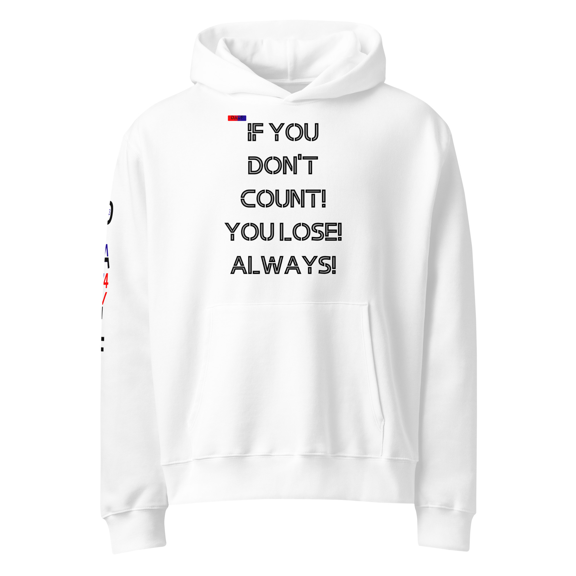 I choose this oversized heavyweight hoodie because IF YOU DONT COUNT YOU LOSE ALWAYS fits my mindset. Honest simple with budget money clarity control and saving. A clean piece that keeps my direction straight.