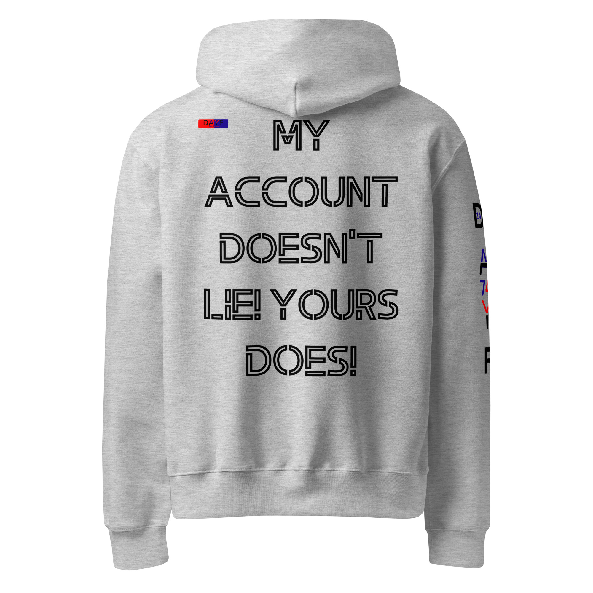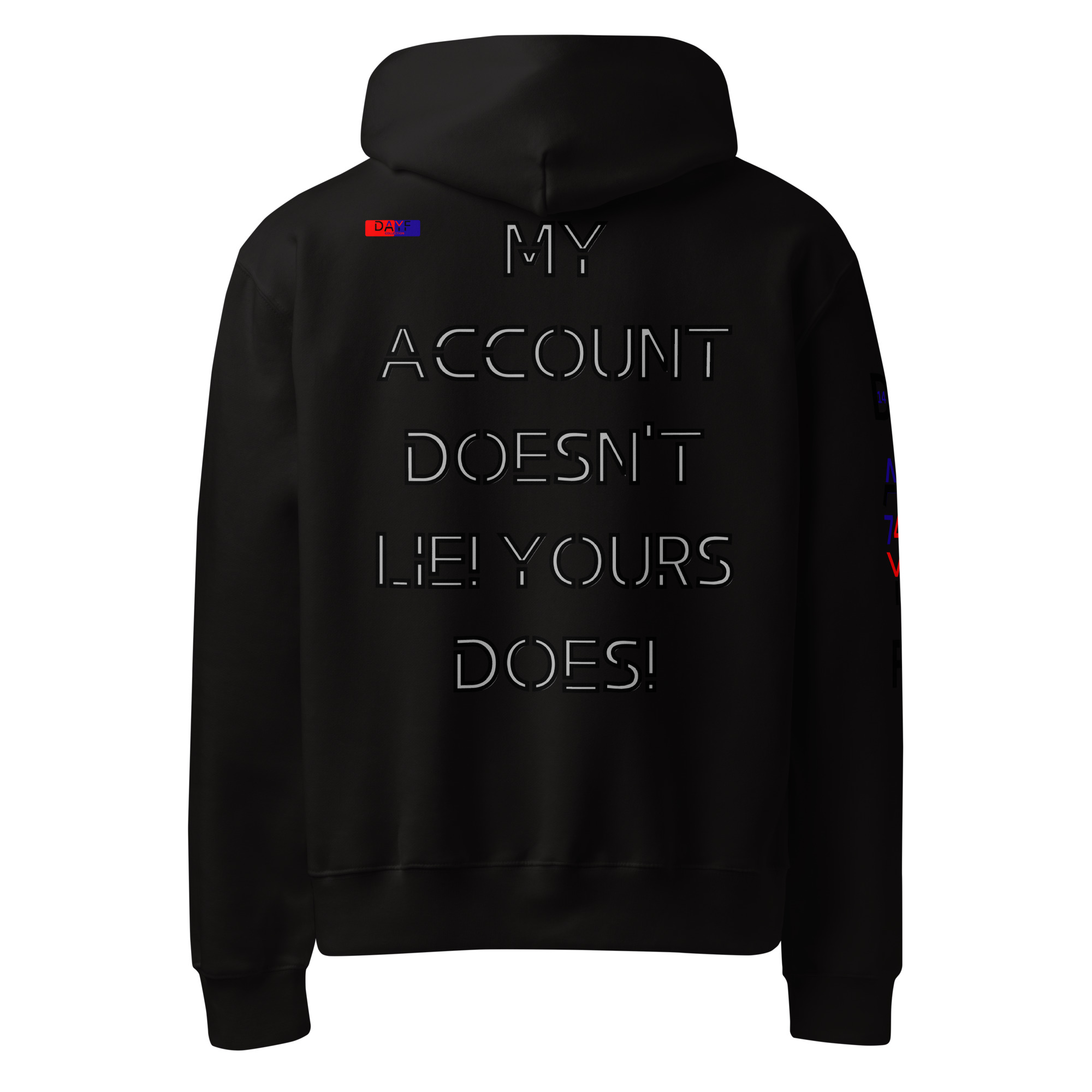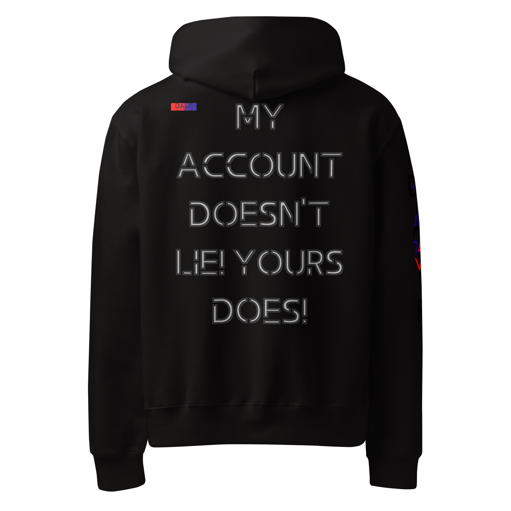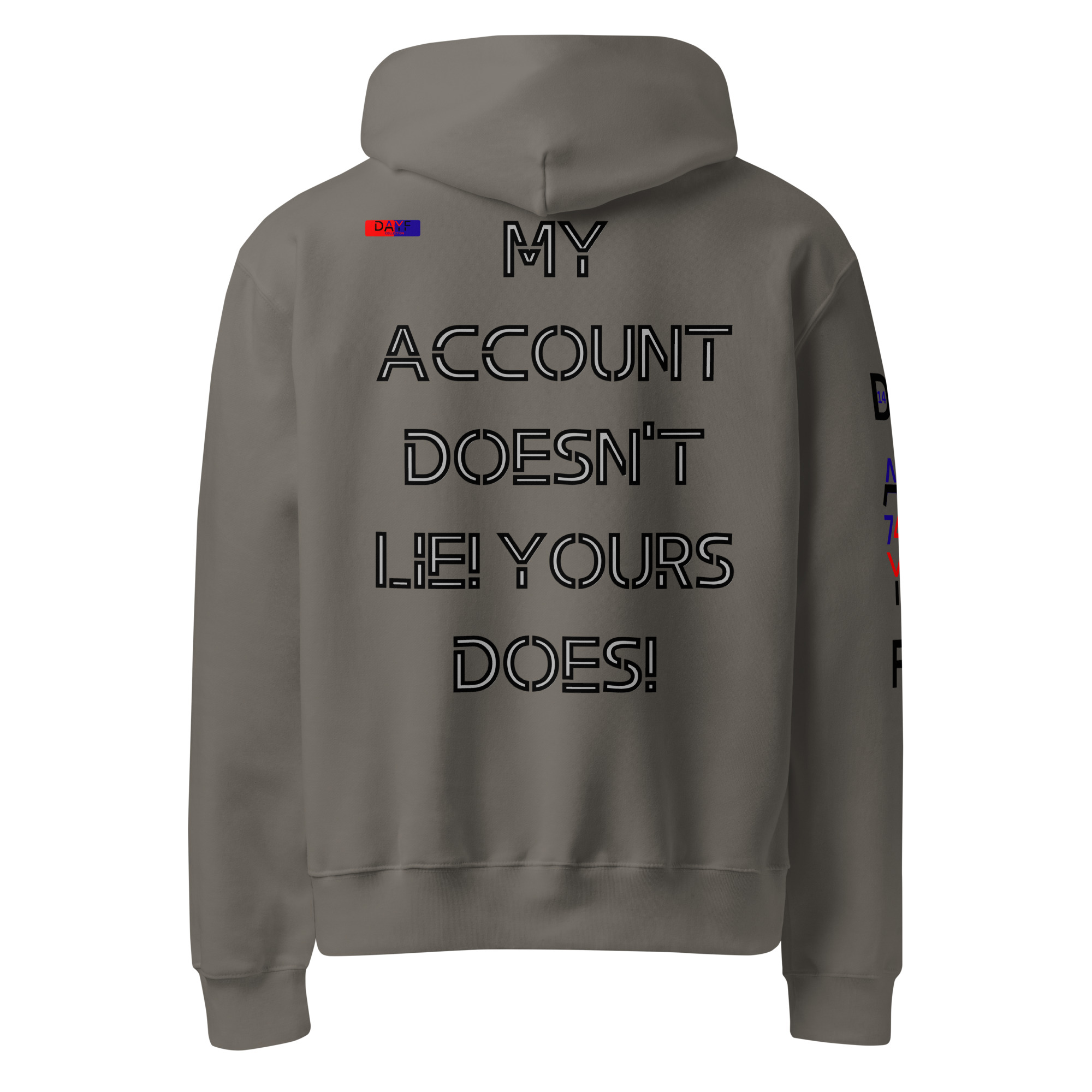 I wear this oversized heavyweight hoodie because MY ACCOUNT DOESNT LIE YOURS DOES on the back fits how I see life. Honest sharp with budget money clarity control and saving. A clean piece that keeps my mindset real.