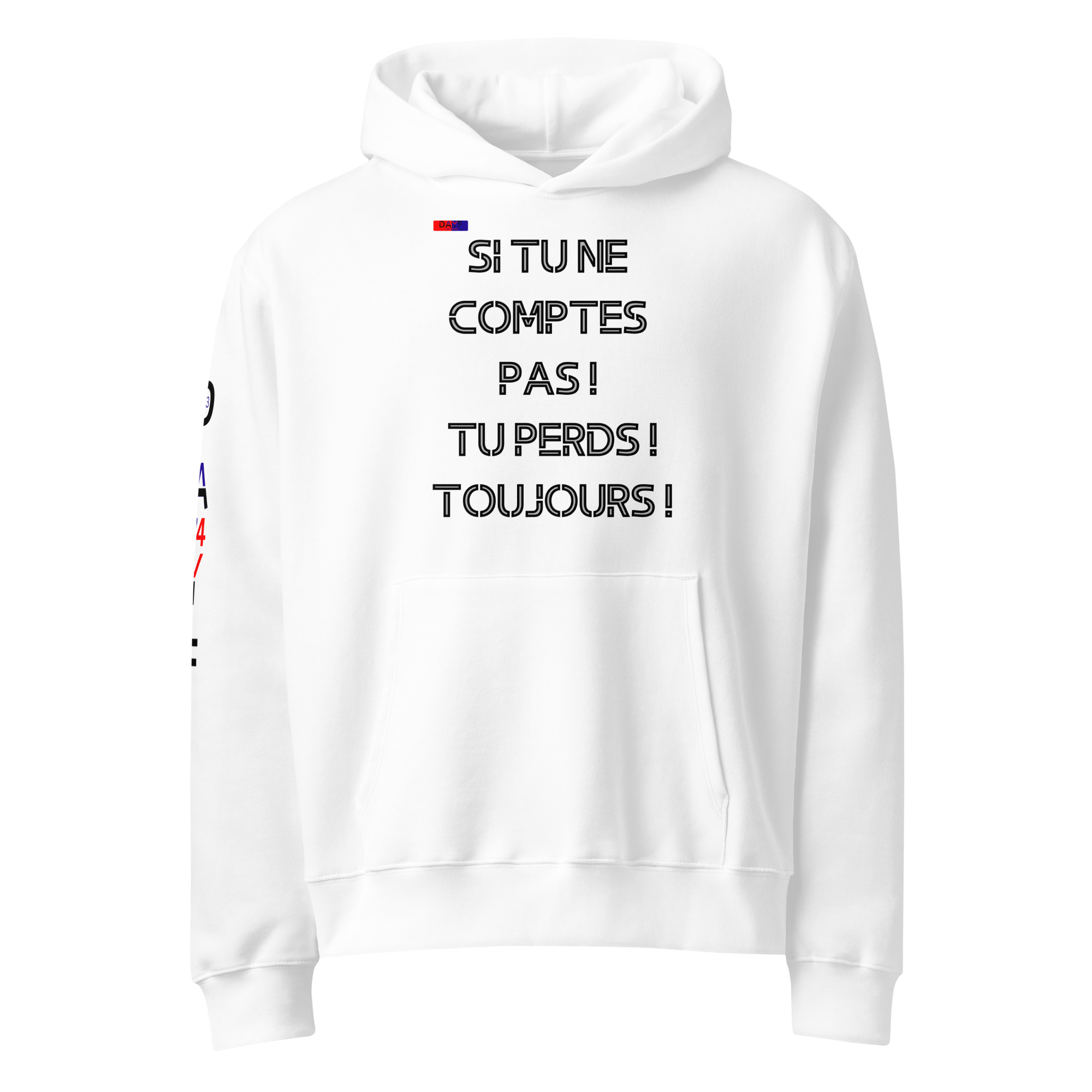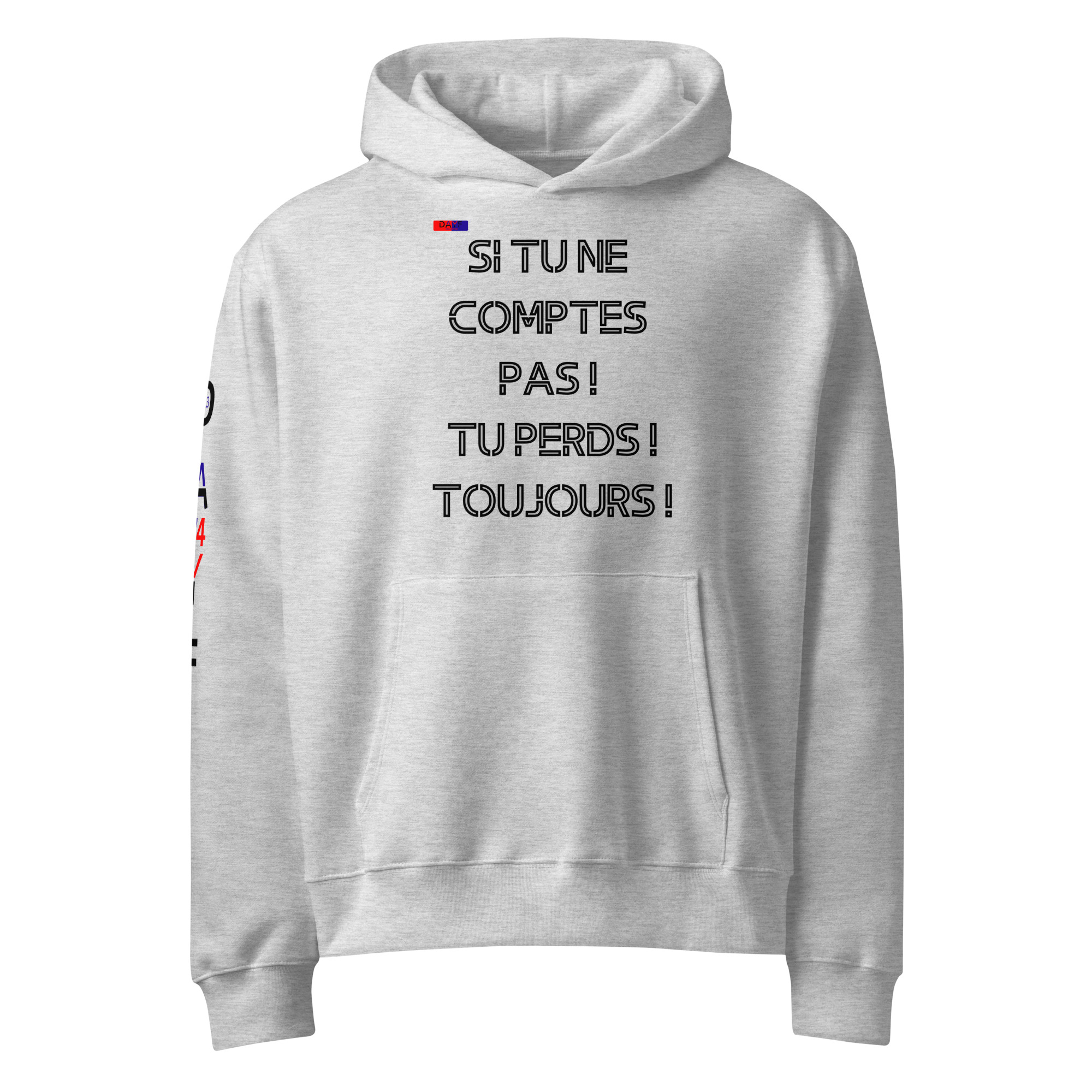 Je choisis ce sweat epais oversize parce que SI TU NE COMPTES PAS TU PERDS TOUJOURS sur le devant dit exactement ce qui est vrai. Honnete calme clair avec budget argent controle clarte et economie. Une piece solide qui reste directe et realiste.