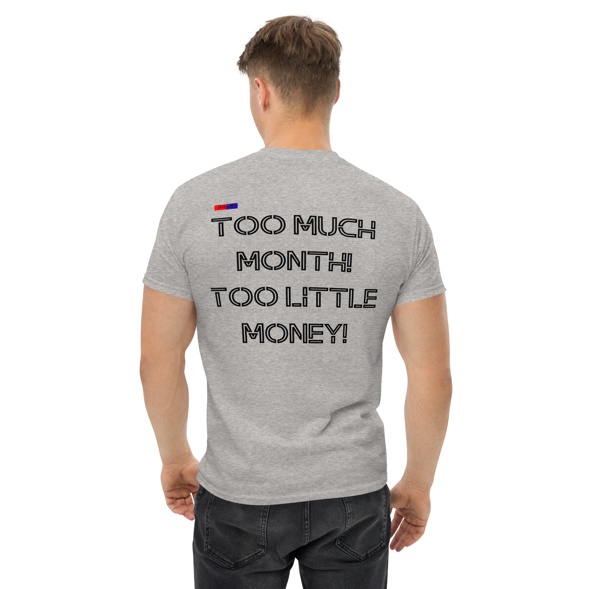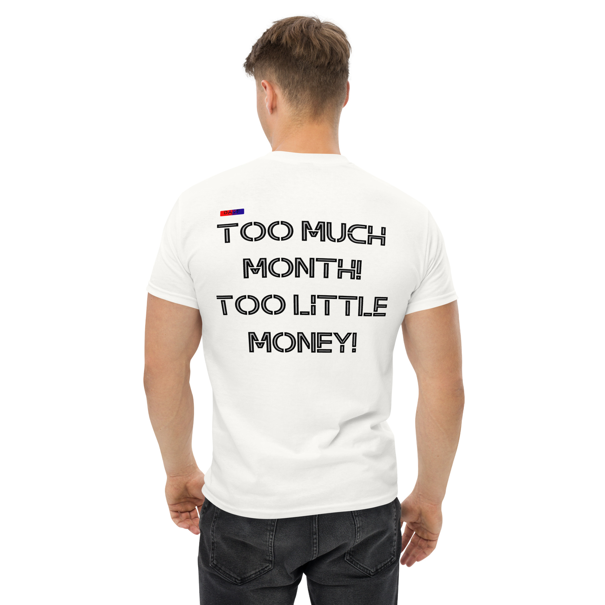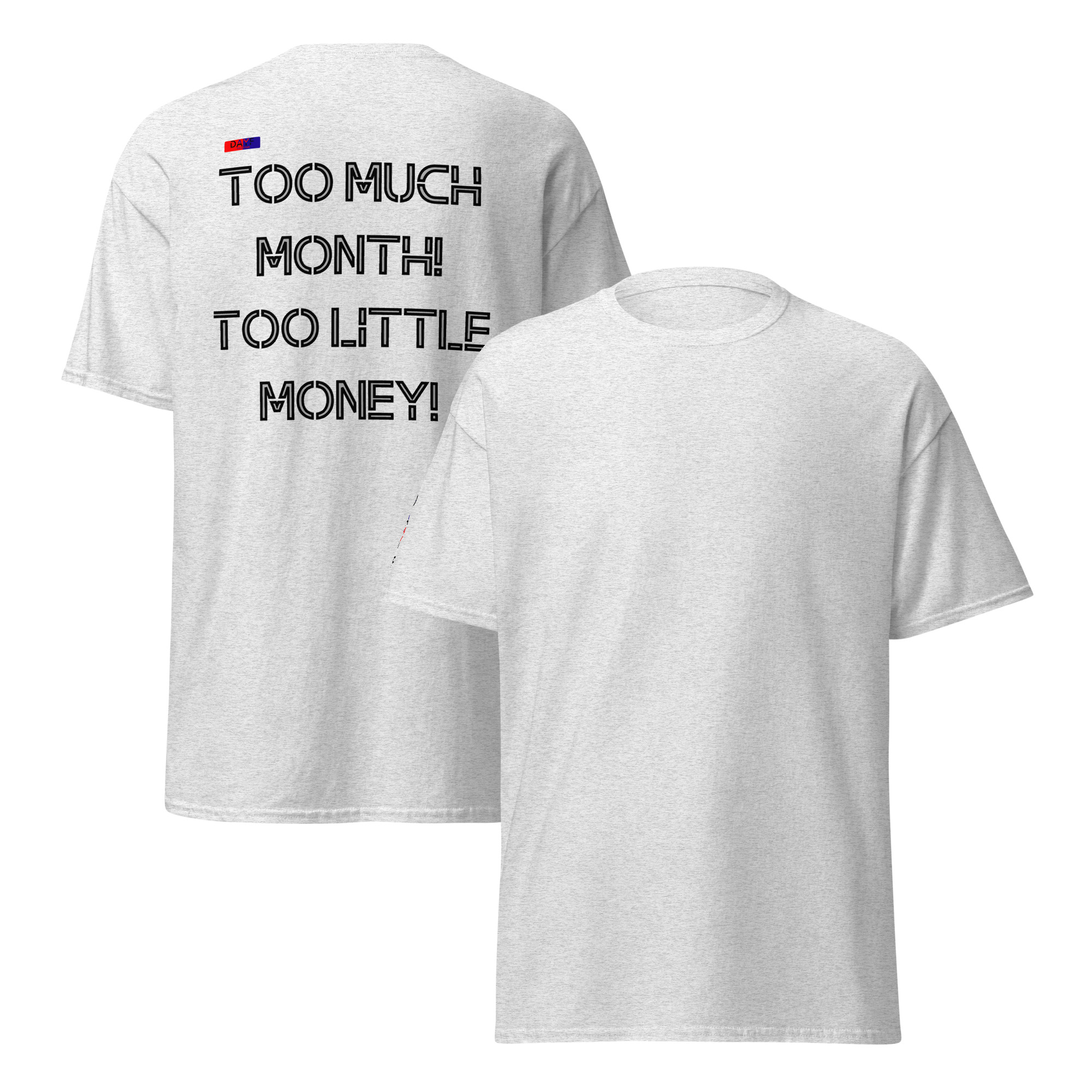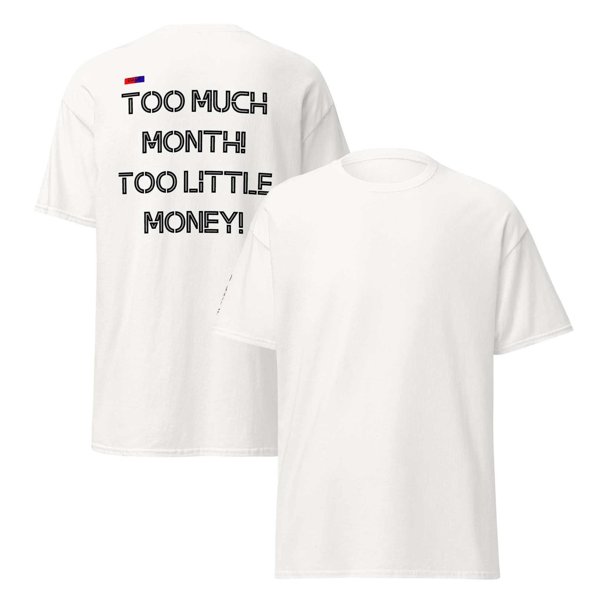 I choose this back print because TOO MUCH MONTH TOO LITTLE MONEY speaks my reality. Honest grounded with budget money clarity control and saving. A clean piece that keeps my mindset steady and real.