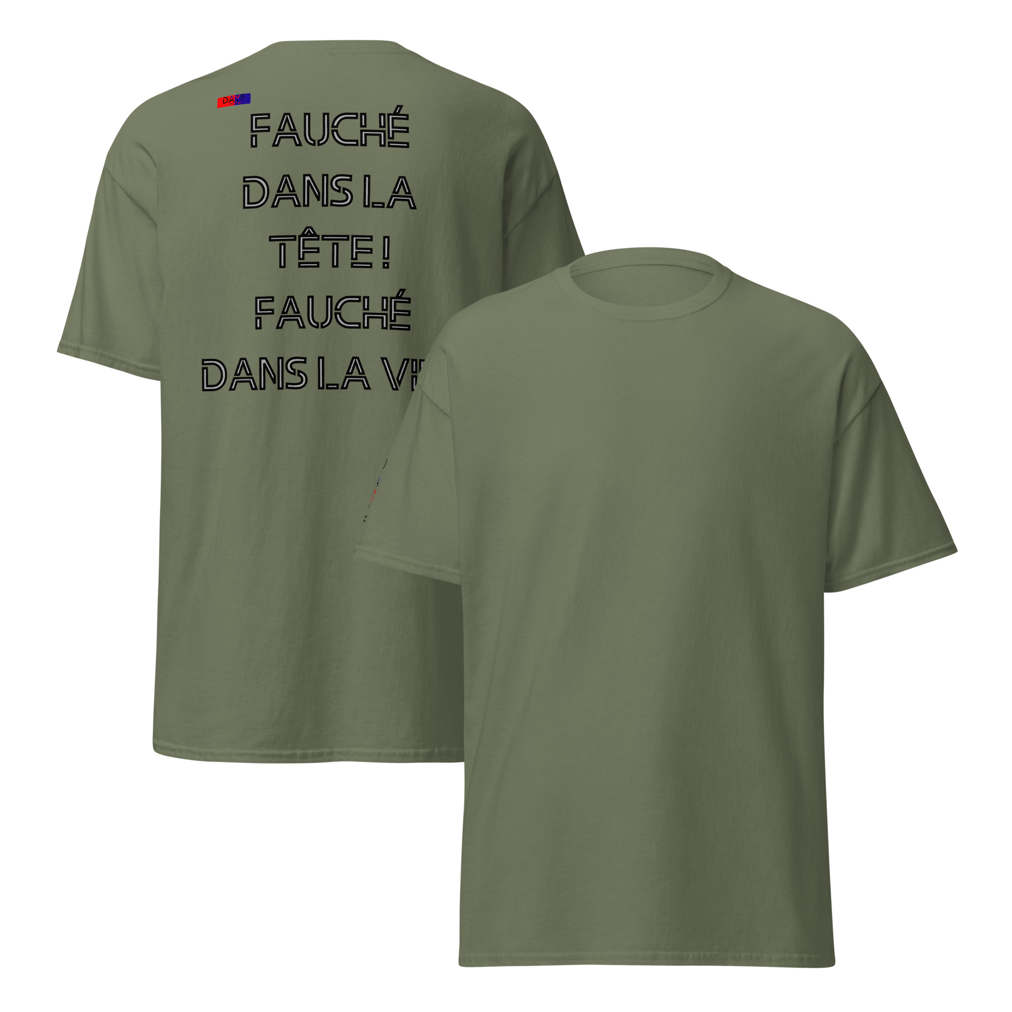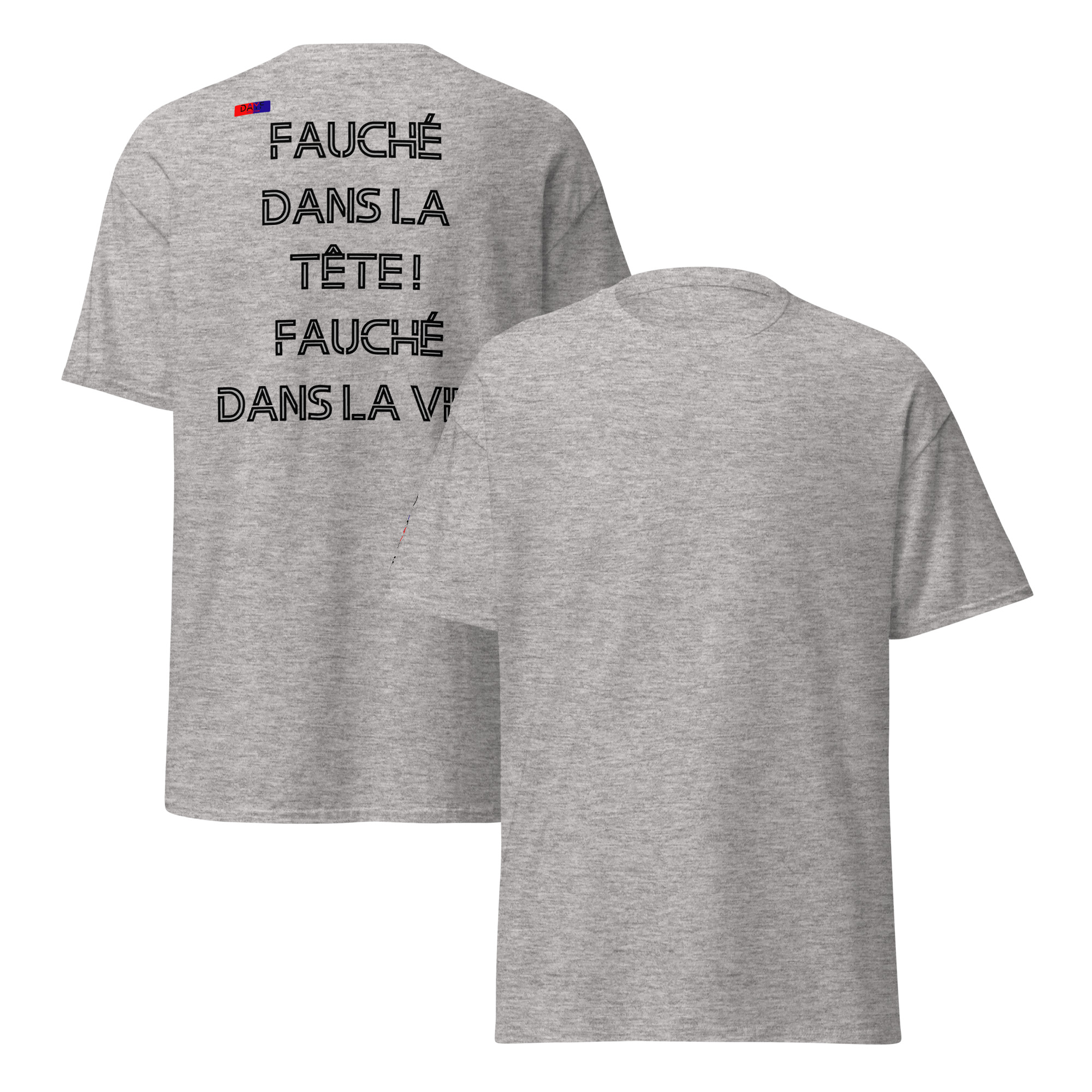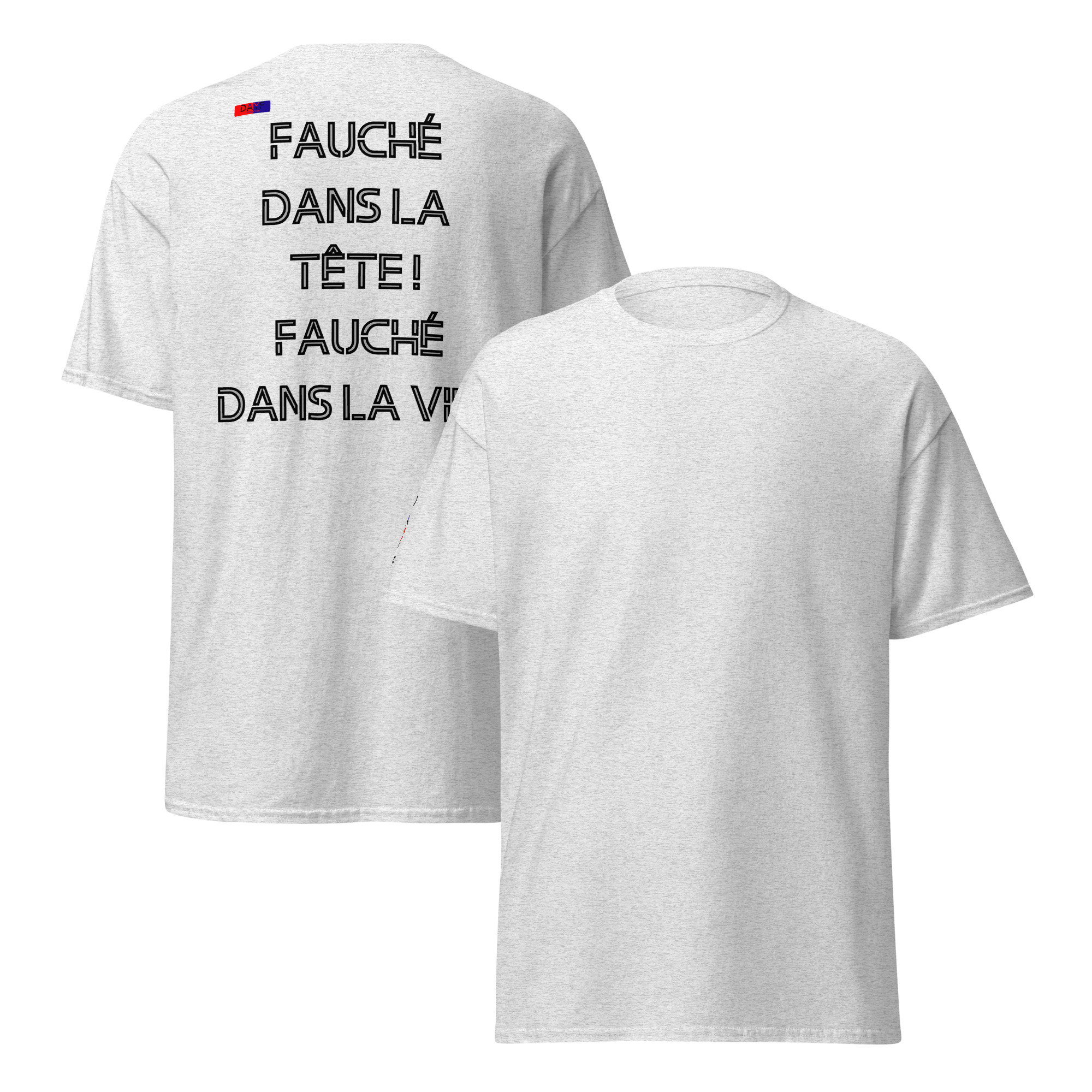 Je porte ce t shirt parce que FAUCHE DANS LA TETE FAUCHE DANS LA VIE dans le dos dit ce que beaucoup ressentent. Honnete calme clair avec budget argent controle clarte et economie. Une piece propre qui reste directe et vraie.