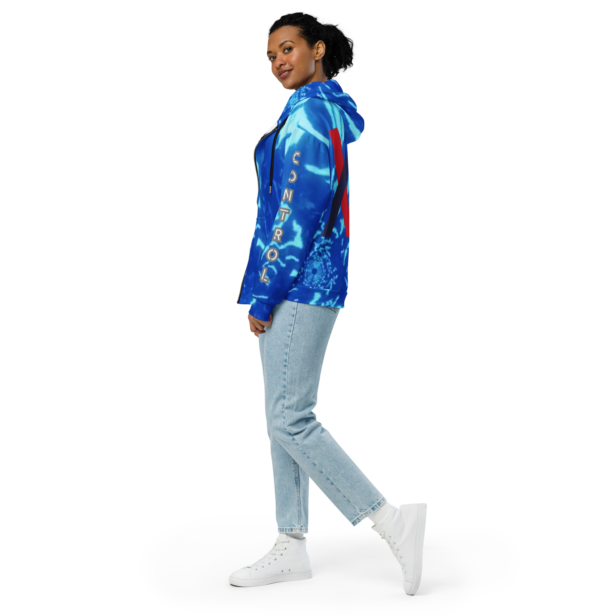 Je choisis ce sweat zippe parce que Control montre comment je garde ma ligne quand tout cherche a me casser le rythme. Calme vrai direct avec controle argent clarte et economie comme appui solide. Une piece allover qui tient quand la journee devient trop lourde a porter.